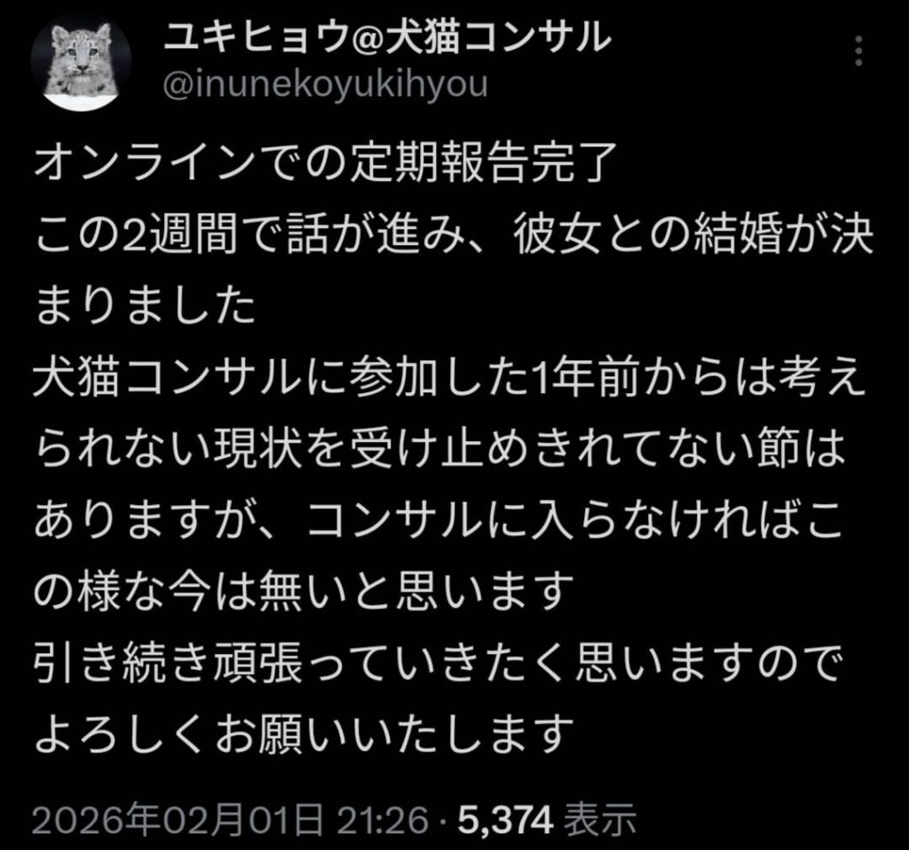 結婚し子供が生まれたコンサル生、彼女いない歴=年齢だったが彼女ができたコンサル生、童貞卒業に成功したコンサル生など、多くの方が犬猫コンサルで結果を出しています。